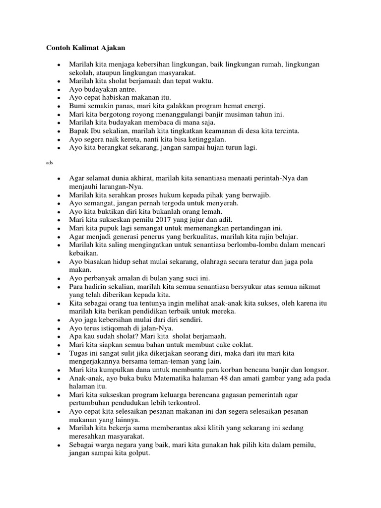 Kalimat persuasif merupakan kalimat yang bersifat ajakan 2. Yuk , ajak keluarga untuk menjaga kebersihan rumah. Lingkungan yang bersih merupakan dambaan semua orang. 4 jalan raya kalimalang blok e no.4 c/d duren sawit,jakarta. Santi ingin mengajak dina pergi ke perpustakaan. Bagi kalian siswa siswi kelas 3 smp dan 3. Kalimat perintah ajakan disebut juga dengan kalimat perintah persuasi. Dedy nurhidayat, se,mm di susun oleh ahmad ripa'i no.absen : •ayo tingkatkan kesadaran buang sampah pada tempatnya agar lingkungan selalu bersih dan sehat! Ayo awasi lingkungan sekitar kita, jangan sampai ada orang mencurigakanberkeliaran di sekitar kita. Bumi ini semakin panas, maka dari itu mari kita terapkan program penghematan energi. Menggunak menggunakan an kalimat kalimat majemu majemuk k setara setara dengan kata penghubung baik. Kelimat persuasif memiliki fungsi lain sebagai kalimat perintah, sehingga dalam penulisannya 24.